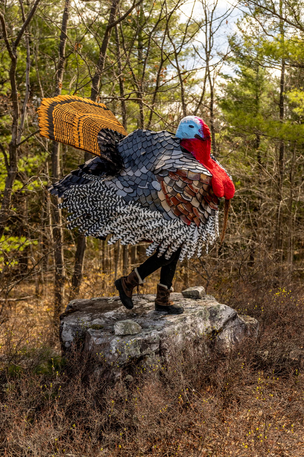 Performance furtive mais ostentatoire sur une terre de chasse en Montérégie. Photographies : Nicolas Gouin. Aide technique au costume : Rachel Tremblay Côté— I remember, when I was very young at my grandmother's house, visiting the neighbor's turkey pen. I remember the turkeys as an agressive animal, a bird that isn't exactly beautiful, even a bit repulsive, or curiously intriguing, but surely impressive to say the least.